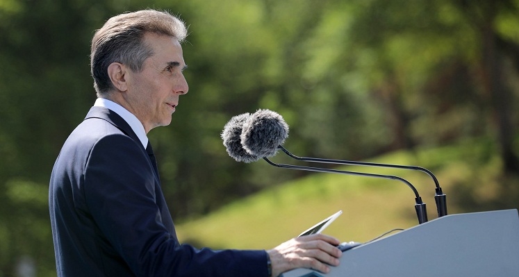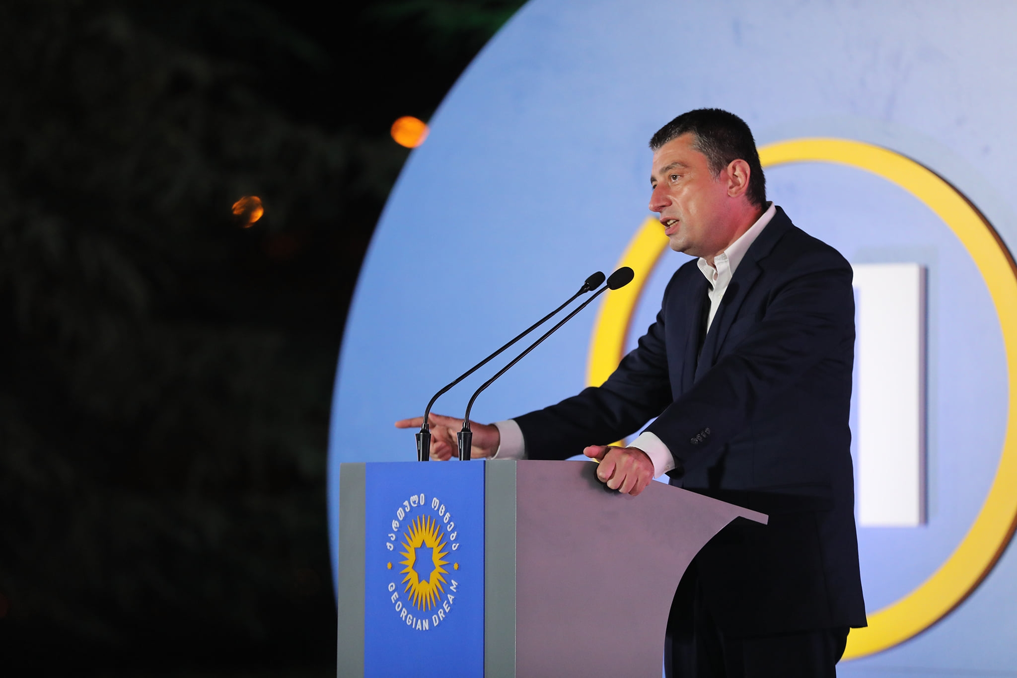 საქართველოს პრემიერ მინისტრი გიორგი გახარია პარტია „ქართული ოცნების“ თავმჯდომარე ბიძინა ივანიშვილს საფრანგეთის საპატიო ლეგიონის კავალერის ტიტულის მინიჭებას ულოცავს.