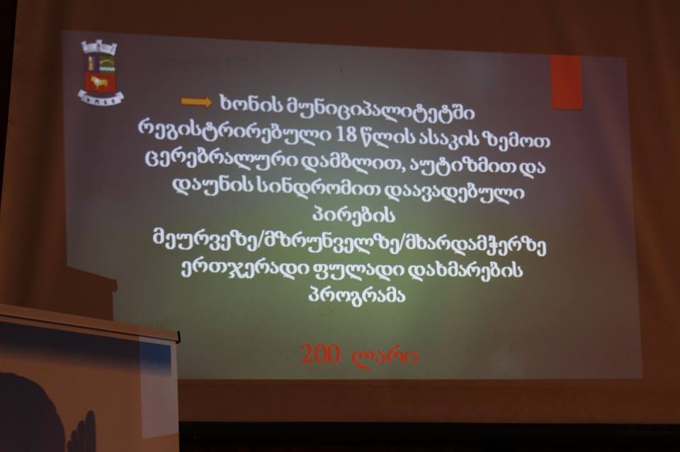 აკადემიკოს ბიძინა ნანეიშვილის სახელობის ხონის ფსიქიკური ჯანმრთელობის ეროვნულ ცენტრში ხონის მუნიციპალიტეტის მერიის სოციალური პროგრამის პრეზენტაცია გაიმართა, რომელსაც მერის მოადგილე გერასიმე მჟავანაძე, საკრებულოს სოციალურ საკითხთა კომისიის თავმჯდომარე ჯუნგლი გოდერიძე და მერიის ადმინისტრაციული სამსახურის უფროსი ამირან კინწურაშვილი ესწრებოდნენ.
