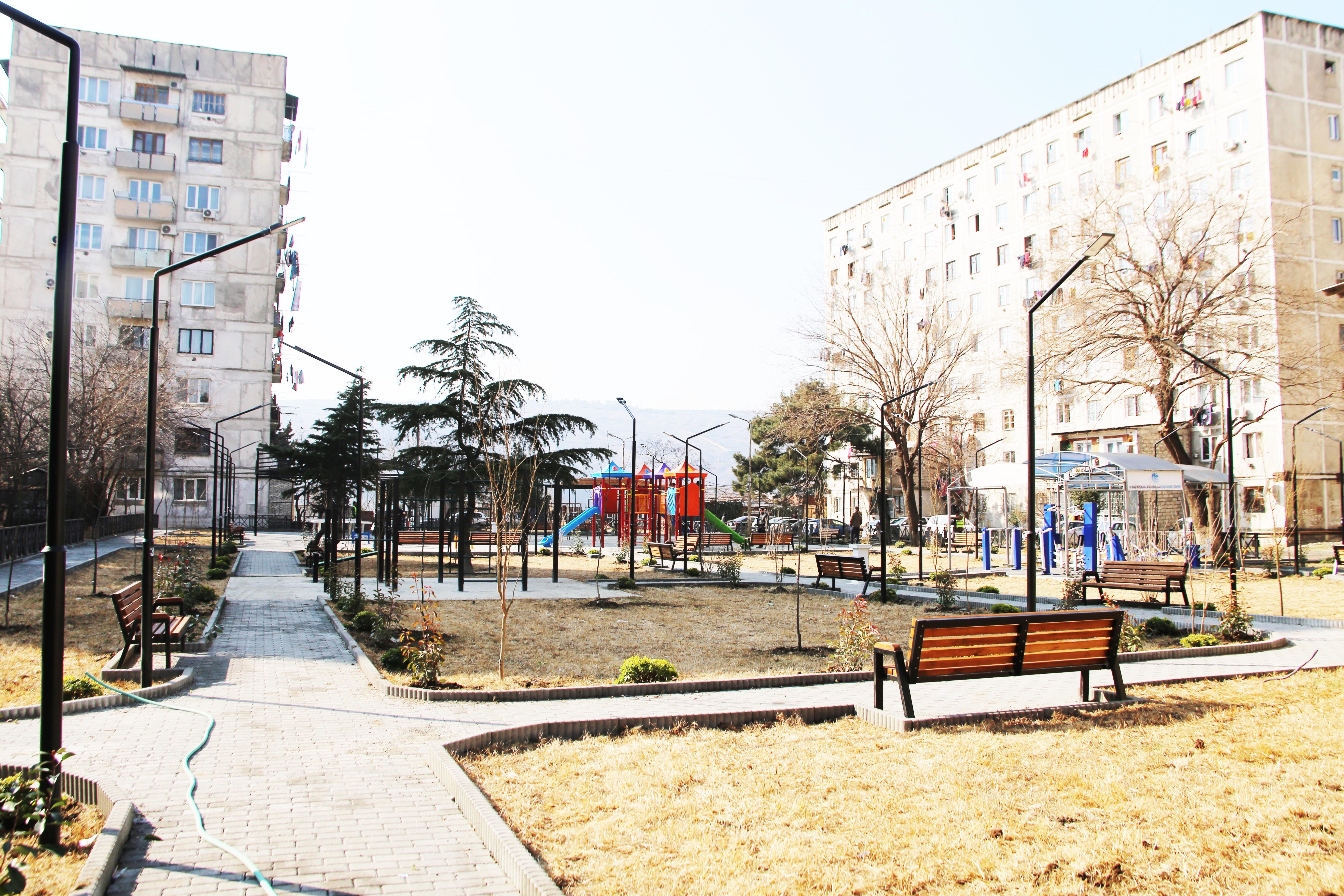 სამგორის რაიონში, მოსკოვის გამზირზე, V კვარტლის №4 კორპუსის მიმდებარე ტერიტორიაზე სკვერის სარეაბილიტაციო სამუშაოები დასრულების ეტაპზეა.