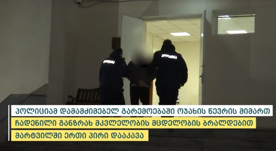 შინაგან საქმეთა სამინისტროს სამეგრელო-ზემო სვანეთის პოლიციის დეპარტამენტის სენაკის რაიონული სამმართველოს და მარტვილის რაიონული სამმართველოს თანამშრომლებმა, ჩატარებული ოპერატიულ-სამძებრო და საგამოძიებო მოქმედებების შედეგად, 1992 წელს დაბადებული ო.ბ., ოჯახის წევრის მიმართ დამამძიმებელ გარემოებაში ჩადენილი განზრახ მკვლელობის მცდელობის ბრალდებით, მარტვილში დააკავეს.