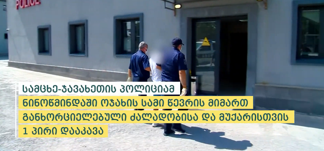 შინაგან საქმეთა სამინისტროს სამცხე-ჯავახეთის პოლიციის დეპარტამენტის ნინოწმინდის რაიონული სამმართველოს თანამშრომლებმა, ჩატარებული ოპერატიულ-საგამოძიებო მოქმედებების შედეგად, ოჯახის წევრების მიმართ განხორციელებული მუქარისა და ძალადობისთვის, 1975 წელს დაბადებული ა.ი. დააკავეს. ინფორმაციას შსს ავრცელებს.