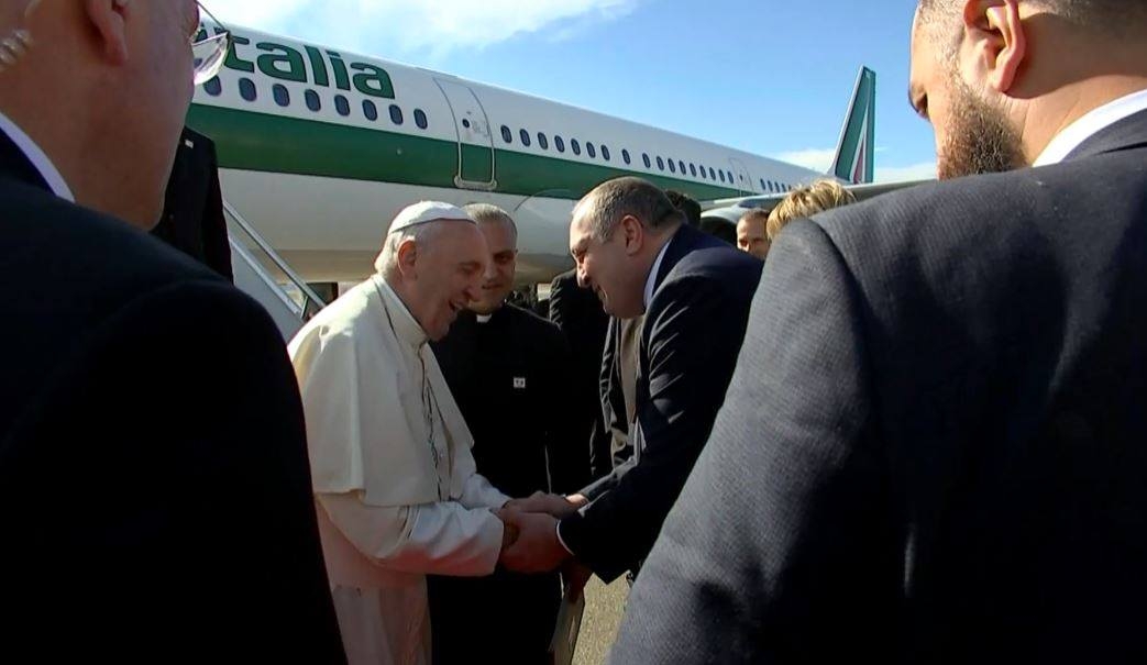 საქართველოში რომის პაპის, ფრანცისკეს ვიზიტი დაიწყო. მას თბილისის საერთაშორისო აეროპორტში პირველ ლედისთან, მაკა ჩიჩუასთან ერთად საქართველოს პრეზიდენტი გიორგი მარგველაშვილი, პარლამენტის თავმჯდომარე დავით უსუფაშვილი და სრულიად საქართველოს კათოლიკოს-პატრიარქი ილია მეორე დახვდნენ.