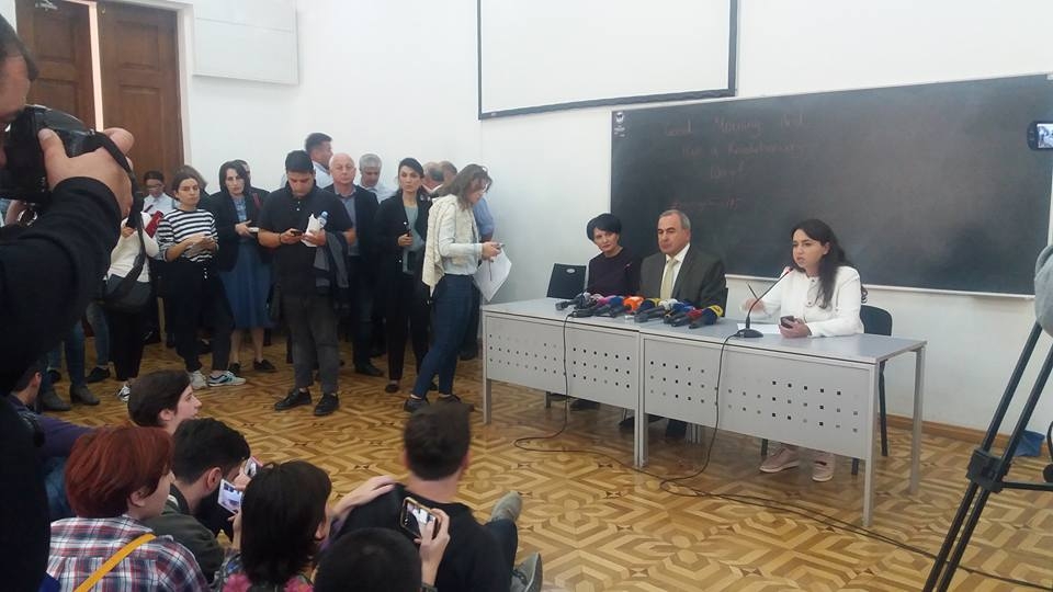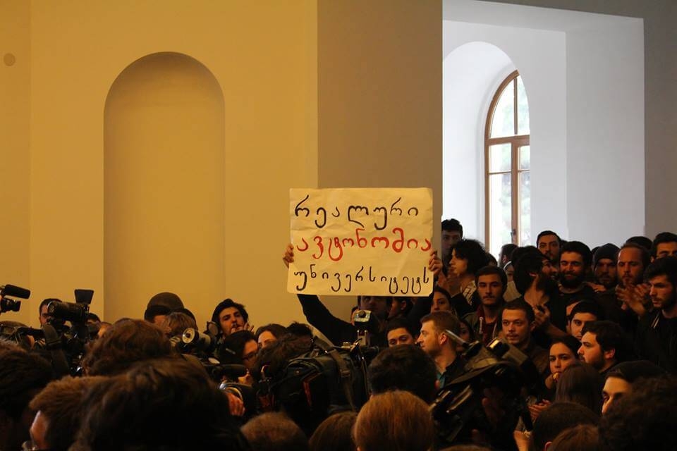 „აუდიტორია 115“-ის სტუდენტები თსუ-ს იმ დერეფანში შესვლას ცდილობენ, სადაც რექტორი გიორგი შარვაშიძე მინისტრებთან და წარჩინებულ პირველკურსელებთან ერთად იმყოფება.