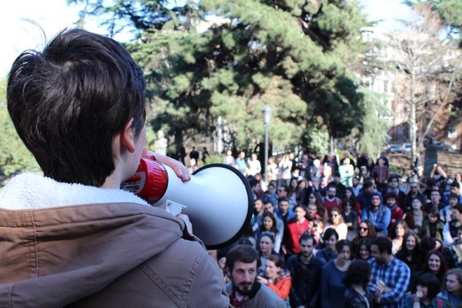 თსუ-ს პირველ კორპუსის ეზოში საპროტესტო აქცია მიმდინარეობს. აუდიტორია 115”-ის წევრები მათ წინააღმდეგ განხორციელებულ ფიზიკურ ზეწოლას აპროტესტებენ.