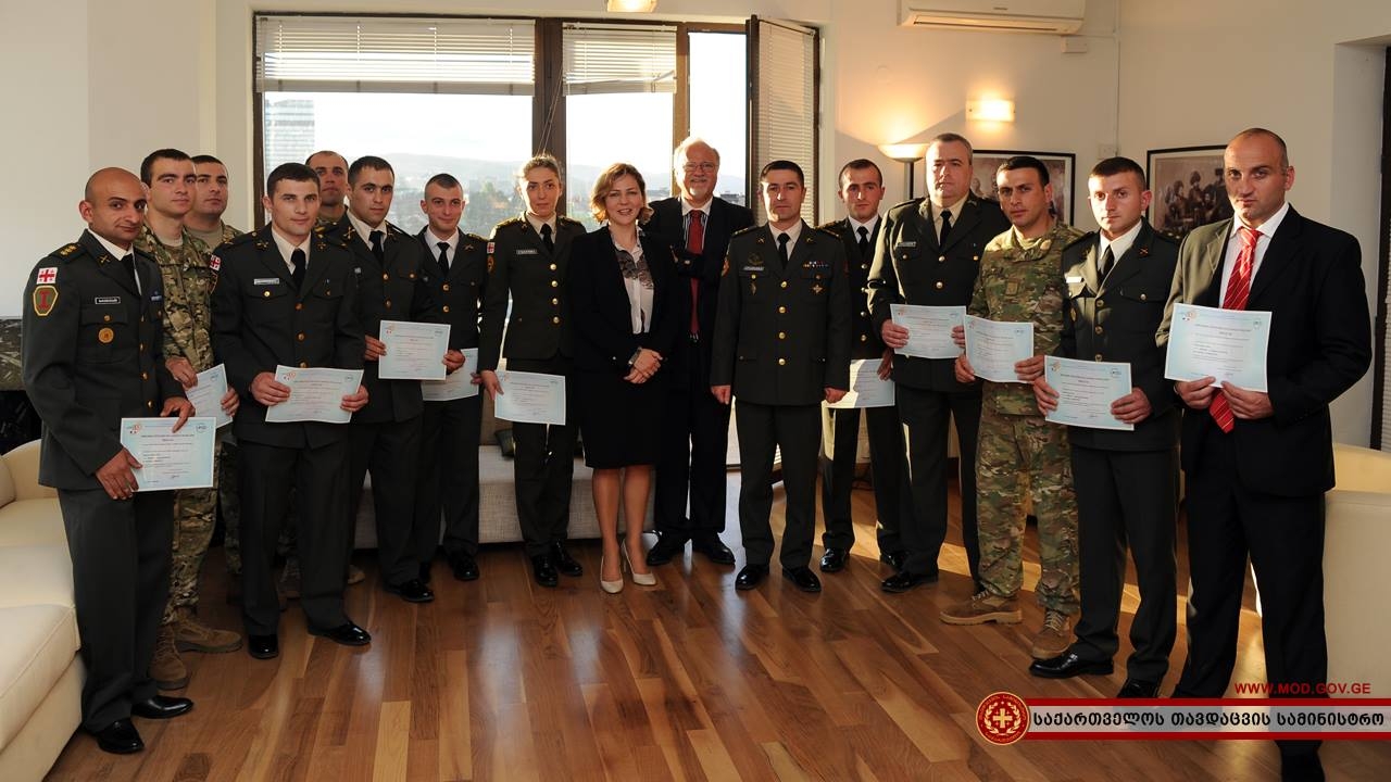 15 სამხედრო მოსამსახურეს სხვადასხვა ქვედანაყოფიდან, მათ შორის, ეროვნული თავდაცვის აკადემიის იუნკერებს DELF (ფრანგული ენის ფლობის დამადასტურებელი დიპლომი) საქართველოში საფრანგეთის რესპუბლიკის ელჩმა, პასკალ მენიემ გადასცა, ორ ქვეყანას შორის თავდაცვის სფეროში არსებულ მჭიდრო თანამშრომლობაზე ისაუბრა და სამხედროებს წარმატებები უსურვა.