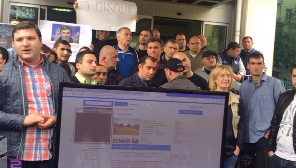 თბილისის მერიასთან "ნაციონალური მოძრაობის" წევრები და მხარდამჭერები 29 ჰექტარი მიწის ნაკვეთთან დაკავშირებული აუქციონის დასრულებას ელოდებიან, რასაც ისინი მერიასთან დამონტაჟებულ ეკრანზე აკვირდებიან.