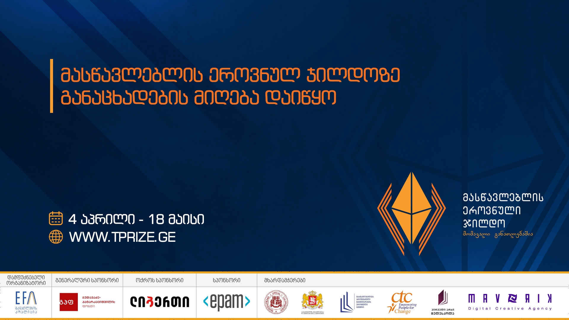 2022 წლის მასწავლებლის ეროვნული ჯილდოს კონკურსზე ნომინირების და აპლიკაციის წარდგენის პერიოდი დაიწყო. მასწავლებლის ეროვნული ჯილდოს ვებგვერდზე www.tprize.ge მასწავლებლების ნომინირება 4 აპრილიდან 13 მაისის, ხოლო აპლიკაციების მიღება 4 აპრილიდან 18 მაისის ჩათვლით იქნება შესაძლებელი.
