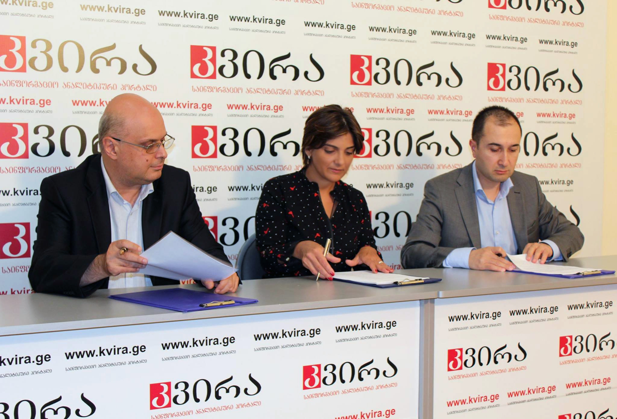 ორგანიზაცია “სითი ინსტიტუტი საქართველომ” და საინფორმაციო-ანალიტიკურმა პორტალმა “კვირამ” თანამშრომლობის მემორანდუმს მოაწერეს ხელი. ხელმომწერები პორტალ “კვირას” დამფუძნებელი და მთავარი რედაქტორი ქეთევან ხოსიტაშვილი და ორგანიზაცია “სითი ინსტიტუტი საქართველოს” თანადამფუძნებლები და დირექტორები მამუკა სალუქვაძე და არჩილ ბარბაქაძე არიან.