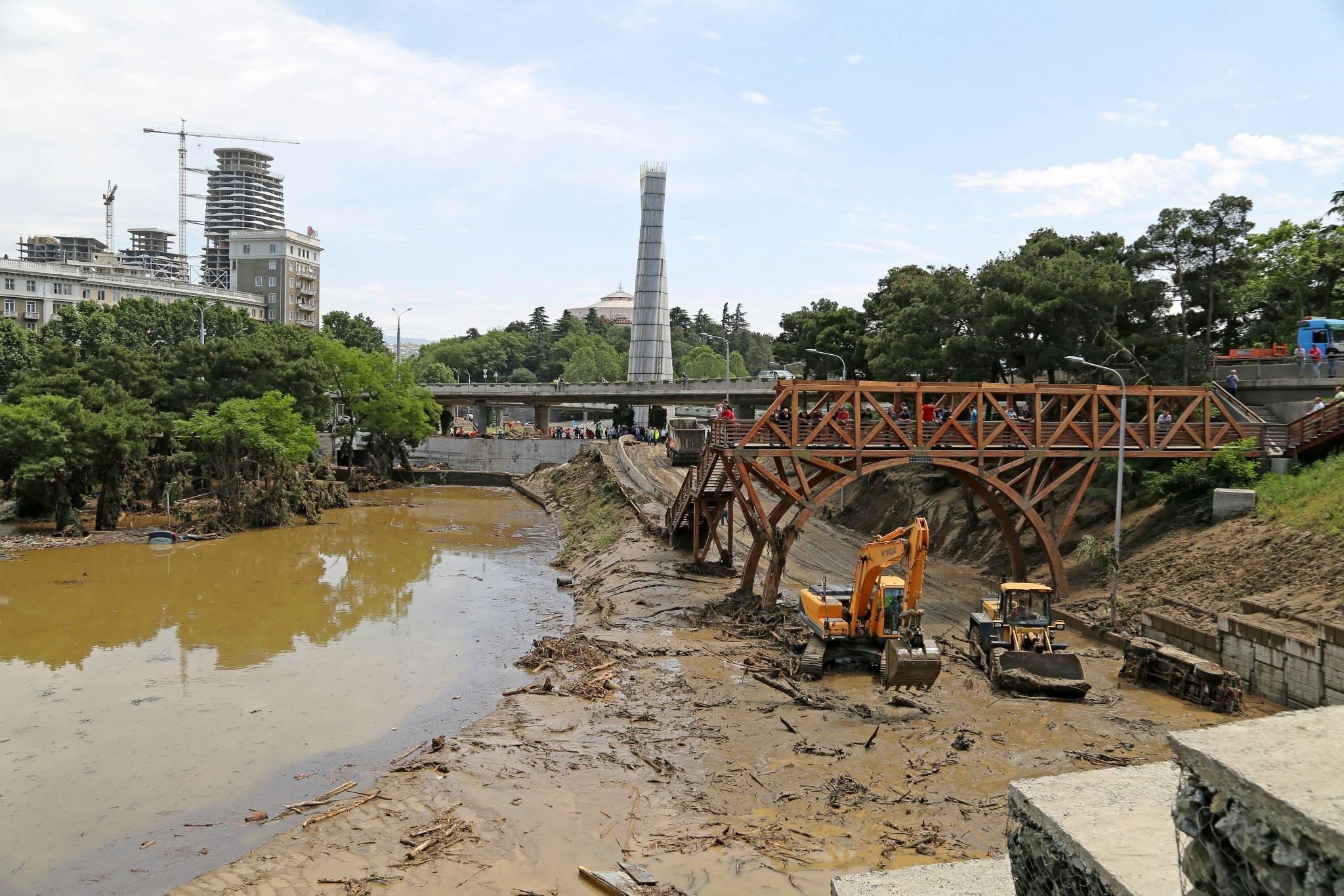 მდინარე ვერეს ხეობაში და გმირთა მოედანზე მობილიზებულია სხვადასხვა უწყების თანამშრომლები, საჭირო ტექნიკა და ინტენსიურად მიმდინარეობს გაწმენდითი სამუშაოები.