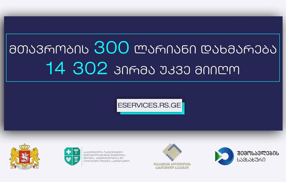 საქართველოს ოკუპირებული ტერიტორიებიდან დევნილთა, შრომის, ჯანმრთელობისა და სოციალური დაცვის სამინისტროს სსიპ დასაქმების ხელშეწყობის სახელმწიფო სააგენტოს ინფორმაციით, მთავრობის 300-ლარიანი დახმარების გაცემა დაიწყო და ის 14 302 პირმა უკვე მიიღო.