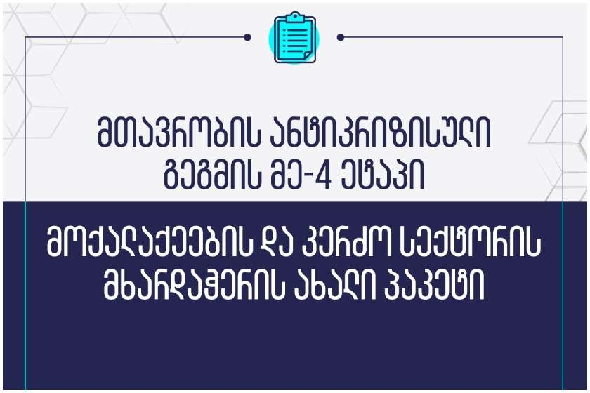 საქართველოში არსებული ეპიდემიოლოგიური ვითარების გათვალისწინებით, პრემიერ-მინისტრის ხელმძღვანელობით მოქმედმა უწყებათაშორისმა საკოორდინაციო საბჭომ ანტიკრიზისული გეგმის მეოთხე ეტაპის ფარგლებში, მოქალაქეების და კერძო სექტორის მხარდაჭერის ახალი პაკეტი მიიღო.