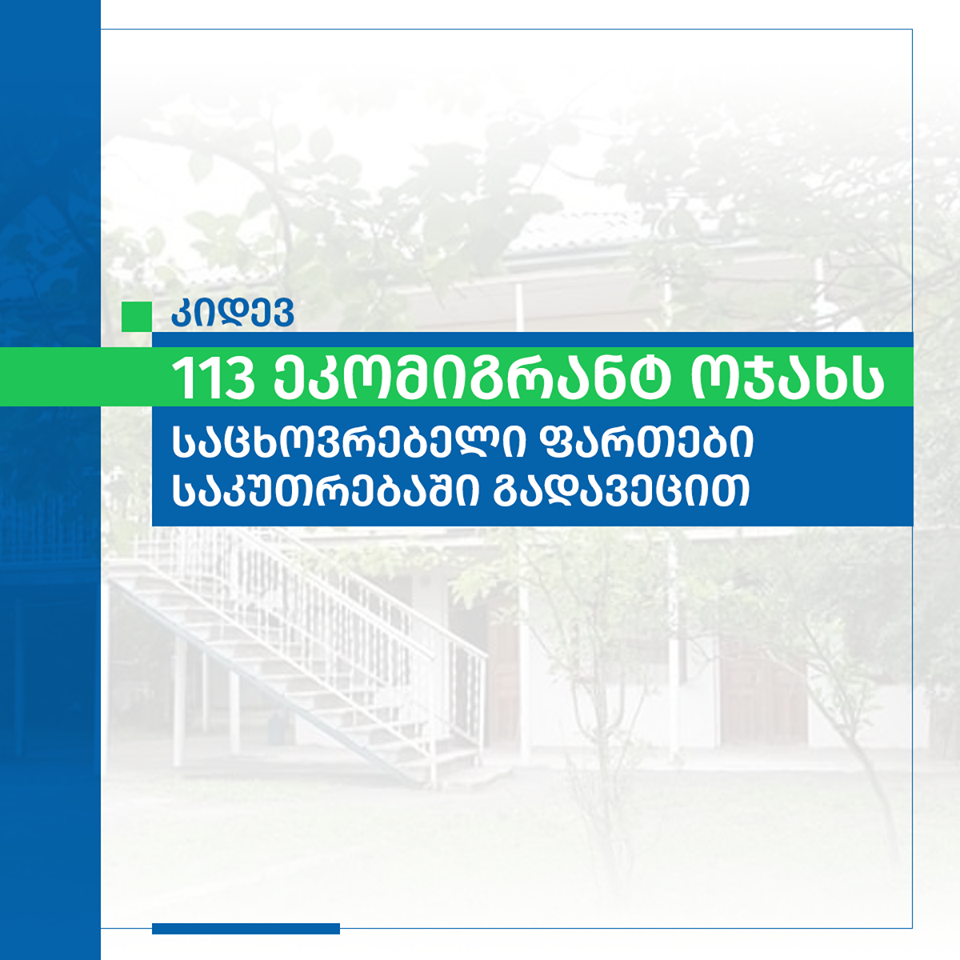 მთავრობის განკარგულებით, კიდევ 113 ეკომიგრანტ ოჯახს, წალკის, თეთრიწყაროს, ნინოწმინდის, ახმეტის, ლაგოდეხის, სიღნაღისა და ხონის მუნიციპალიტეტებში სახლები საკუთრებაში უსასყიდლოდ გადაეცემა.