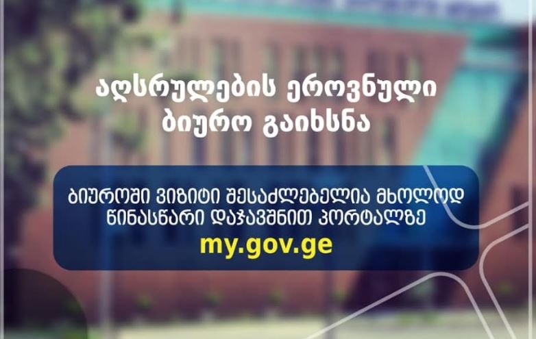 აღსრულების ეროვნული ბიურო გაიხსნა. ბიუროში აცხადებენ, რომ აუცილებელია ვიზიტის წინასწარი დაჯავშნა მოქალაქეთა პორტალზე my.gov.ge.