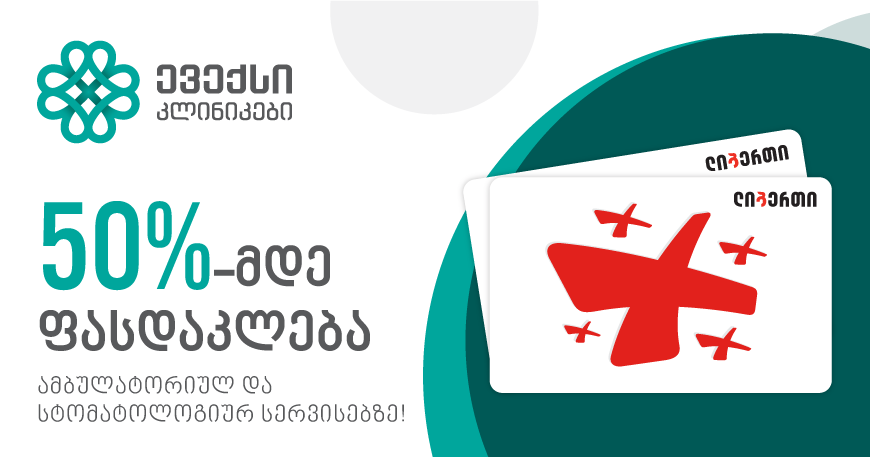 დღეიდან, ლიბერთის სოციალური ბარათის მფლობელები, მთელი საქართველოს მასშტაბით ევექსი კლინიკების ქსელში ამბულატორიულ და სტომატოლოგიურ მომსახურებას 50%-მდე ფასდაკლებით მიიღებენ.