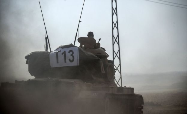 ათეულობით თურქულმა ტანკმა თურქეთ–სირიის საზღვარი გადაკვეთა და სირიის ტერიტორიაზე შევიდა მას შემდეგ, რაც ანკარამ ე.წ. ისლამური სახელმწიფოს სამიზნეებს საარტილერიო ცეცხლი გაუხსნა, ზოგიერთი სამიზნე კი სამხედრო თვითმფრინავებით დაბომბა.
