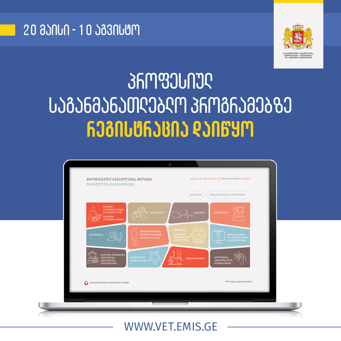 წელს პირველად პროფესიულ საგანმანათლებლო პროგრამებზე რეგისტრაციის ხანგრძლივობა გაიზარდა და სასურველ პროგრამაზე დარეგისტრირება შესაძლებელია 20 მაისიდან 10 აგვისტოს ჩათვლით კოლეჯების დისტანციური მხარდაჭერით ან/და ონლაინ: www.vet.emis.ge.