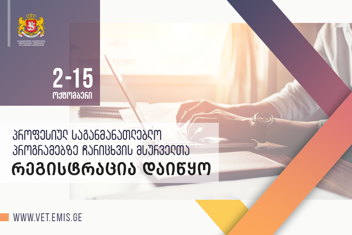 საქართველოს განათლების, მეცნიერების, კულტურისა და სპორტის სამინისტრო, 2 ოქტომბრიდან 15 ოქტომბრის ჩათვლით, პროფესიული განათლების მიღების მსურველთა რეგისტრაციას აცხადებს.