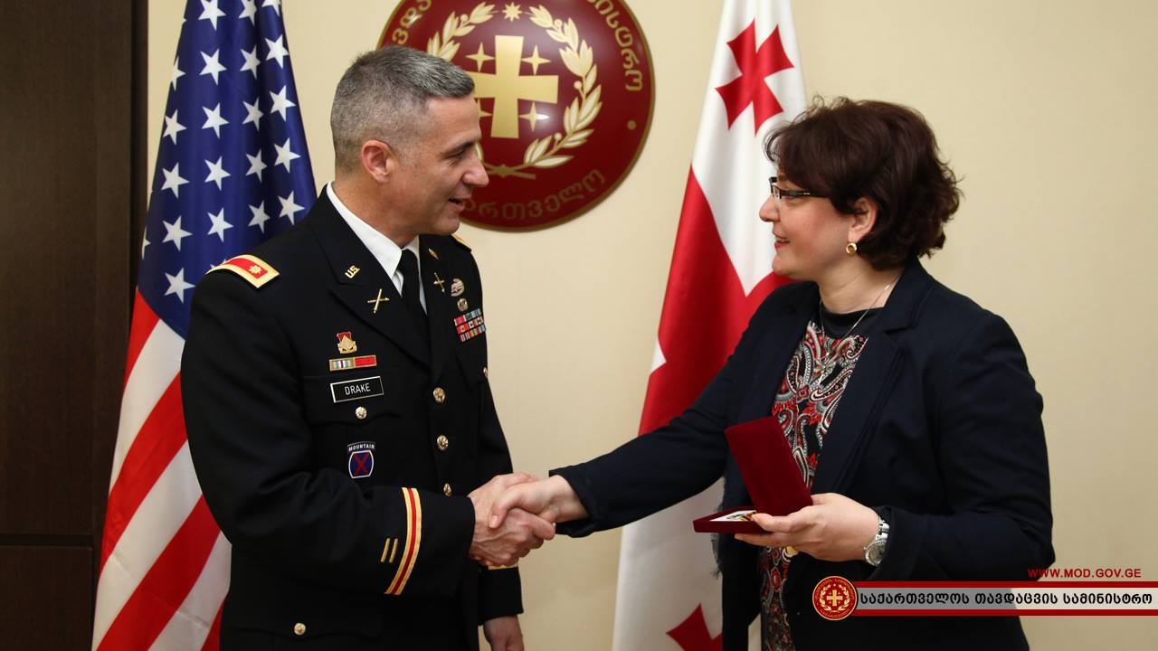 დღეს, საქართველოს თავდაცვის მინისტრმა თინათინ ხიდაშელმა თავდაცვის სფეროში თანამშრომლობის ოფისის (ODC) უფროსის მოადგილე მაიორი ჯონათან დრეიკი მედლით – „გენერალი მაზნიაშვილი“ დააჯილდოვა.